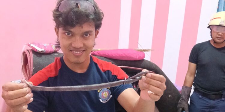 Kediri — Petugas Pemadam Kebakaran (Damkar) Kabupaten Kediri mengevakuasi seekor ular cobra yang ditemukan di dalam rumah warga di Kecamatan...