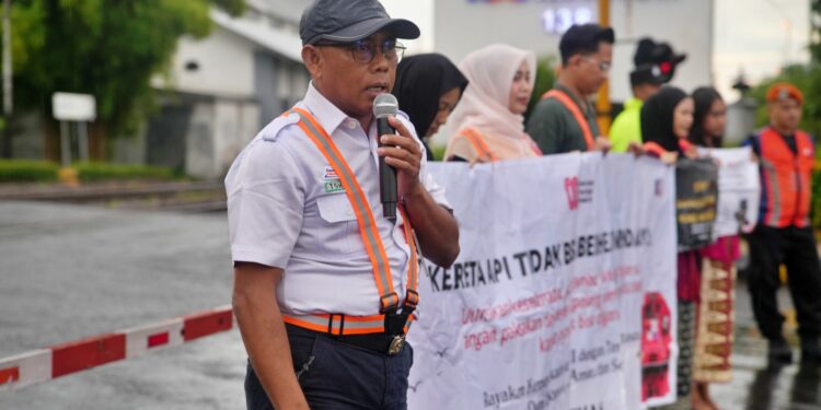 Madiun – PT Kereta Api Indonesia (Persero) Daerah Operasi (Daop) 7 Madiun menggelar sosialisasi keselamatan di perlintasan sebidang dengan cara...