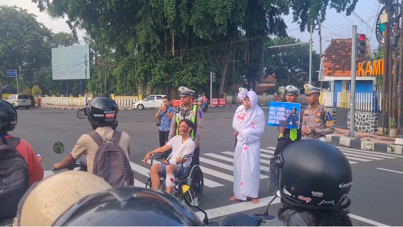 BLITAR – Satuan Lalu Lintas (Satlantas) Polres Blitar Kota menggelar sosialisasi Operasi Keselamatan Semeru 2026 dengan cara unik. Petugas membawa replika pocong serta menghadirkan peraga korban kecelakaan lalu lintas penyandang disabilitas untuk menarik perhatian pengguna jalan.