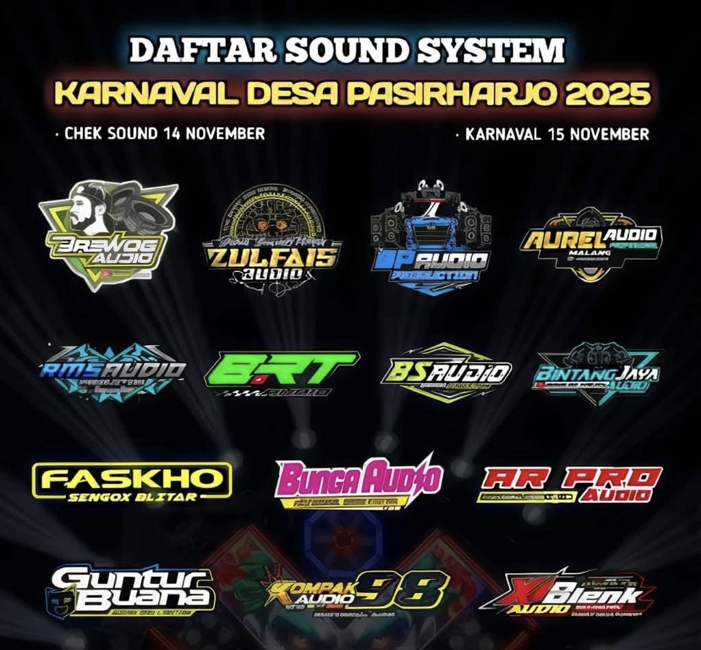 BLITAR – Setelah sebelumnya dikenal meriah di berbagai daerah, kini giliran Desa Pasirharjo, Kecamatan Talun, Kabupaten Blitar, yang akan dimeriahkan oleh deretan sound horeg ternama Jawa Timur. Acara tersebut akan digelar dalam rangka karnaval desa yang berlangsung pada 15 November 2025.