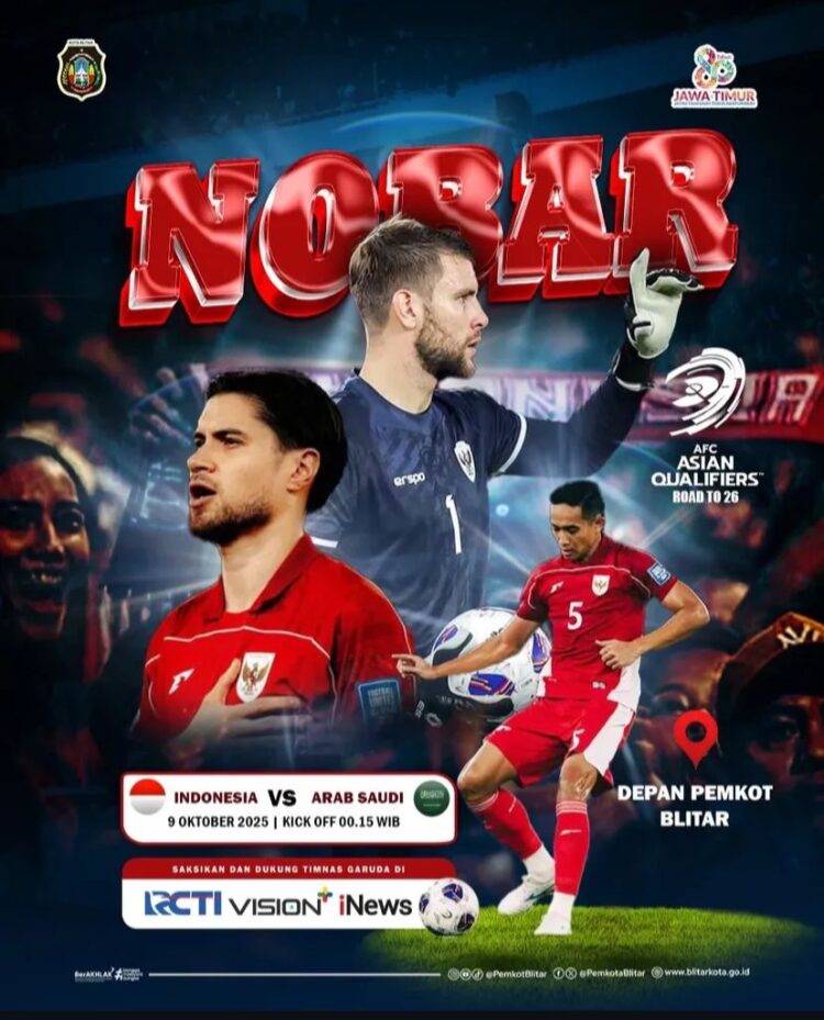 Blitar – Pemerintah Kota (Pemkot) Blitar menggelar acara nonton bareng (nobar) pertandingan kualifikasi Piala Dunia 2026 antara Tim Nasional Indonesia melawan Arab Saudi, Kamis (9/10) dini hari.