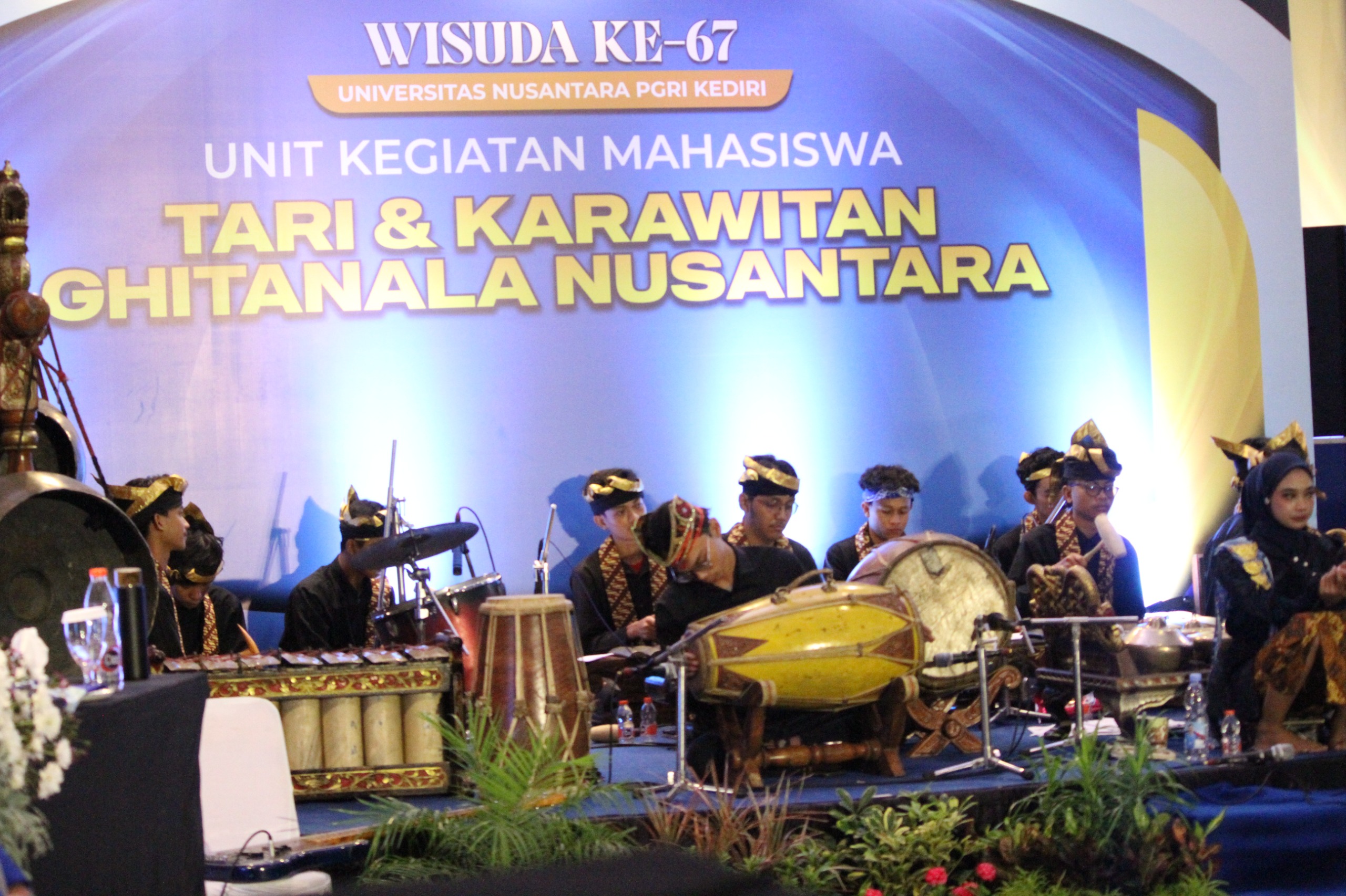 Kediri – Denting gamelan mengalun syahdu di sela prosesi Wisuda ke-67 Universitas Nusantara PGRI (UNP) Kediri. Suara bonang, saron, dan kenong berpadu menciptakan suasana sakral yang menandai langkah baru para wisudawan. Di balik harmoni itu, tangan-tangan muda dari UKM Tari dan Karawitan (TK) Ghitanala Nusantara kembali dipercaya kampus untuk mengiringi momen bersejarah tersebut.