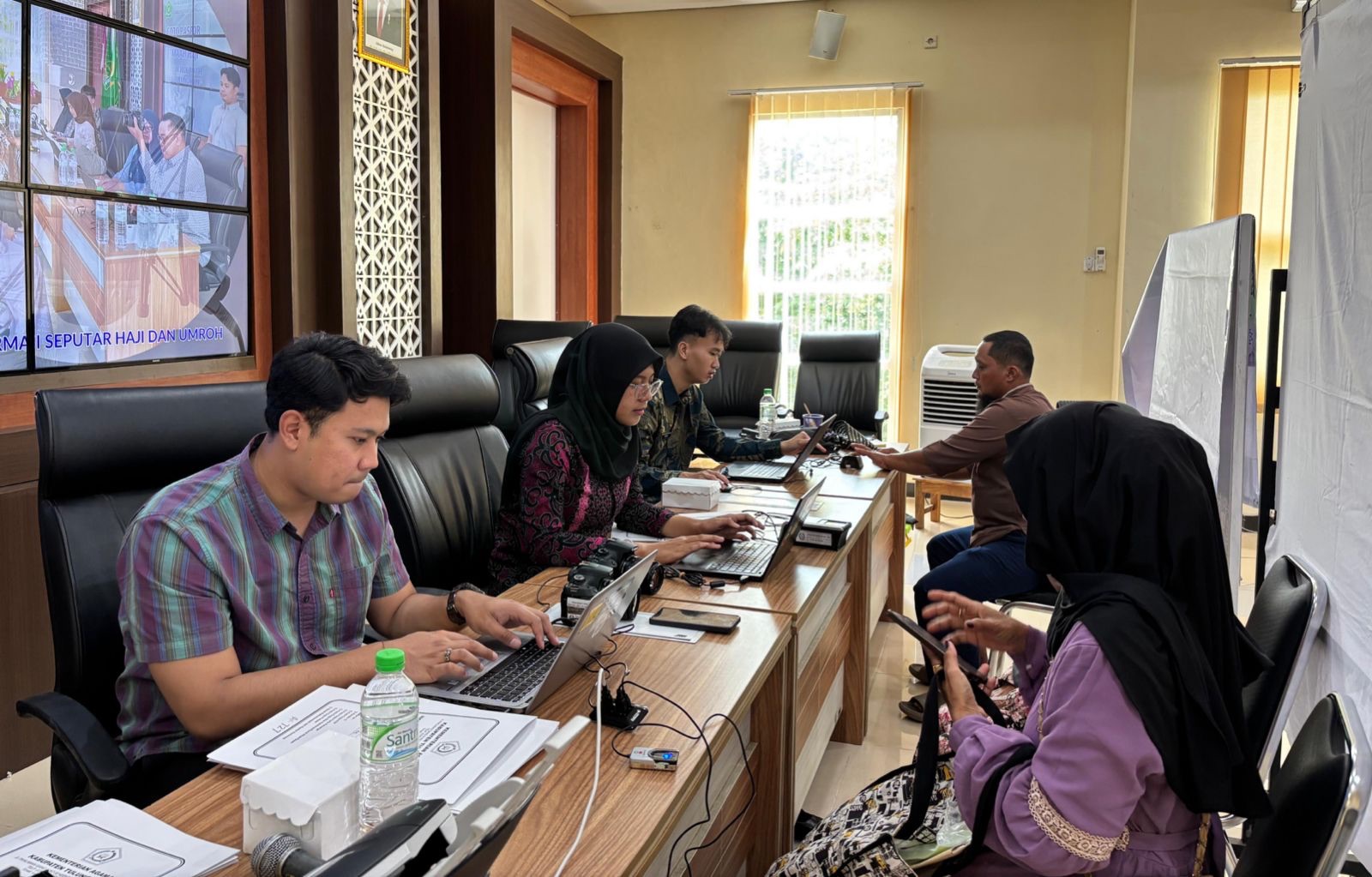 Proses pengambilan foto dan sidik jari dilakukan langsung di lokasi, sehingga seluruh jamaah dapat menyelesaikan tahapan pembuatan paspor secara lengkap tanpa hambatan.