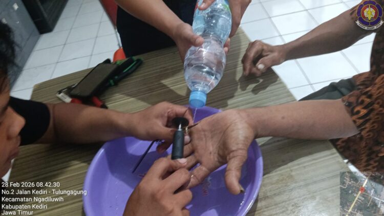 Kediri – Seorang warga Kecamatan Ngadiluwih meminta bantuan petugas pemadam kebakaran untuk melepaskan cincin yang tersangkut di jari kelingkingnya, Sabtu (28/2/2026) pagi.
