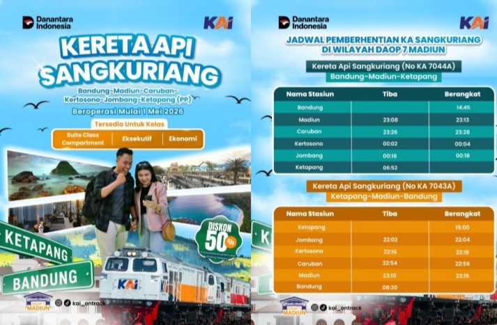 “Selama ini pelanggan dari wilayah Daop 7 Madiun yang menuju Banyuwangi dilayani KA Logawa dan KA Wijayakusuma. Dengan hadirnya KA Sangkuriang, masyarakat memiliki lebih banyak pilihan jadwal sehingga perjalanan menjadi lebih fleksibel,” ujarnya, Senin (27/4/2026)