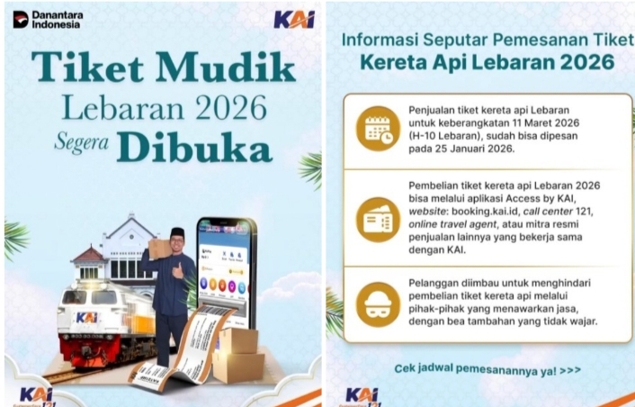 Adapun jadwal pembukaan pemesanan tiket Lebaran 2026 dilakukan secara bertahap, mulai 25 Januari 2026 untuk keberangkatan 11 Maret 2026 hingga 15 Februari 2026 untuk keberangkatan 1 April 2026.