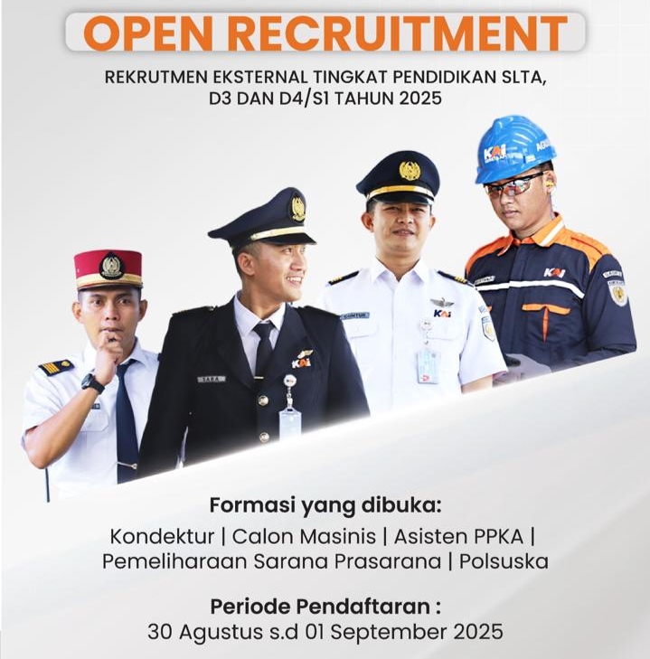 Madiun – PT Kereta Api Indonesia (Persero) kembali membuka rekrutmen eksternal untuk tahun 2025 bagi lulusan SLTA, D3, dan D4/S1. Pendaftaran akan dibuka mulai 30 Agustus hingga 1 September 2025 melalui situs resmi KAI di https://e-recruitment.kai.id.