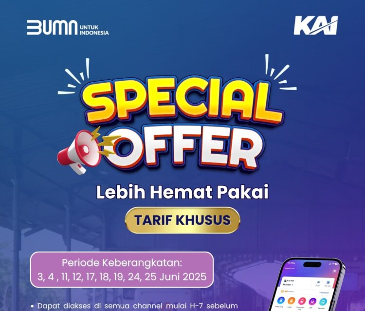 Madiun – PT Kereta Api Indonesia (KAI) Daerah Operasi (Daop) 7 Madiun kembali menghadirkan promo tarif khusus bertajuk Special Offer selama bulan Juni 2025. Promo ini menjadi bagian dari komitmen KAI dalam menyediakan layanan transportasi yang terjangkau, nyaman, dan mudah diakses oleh masyarakat.