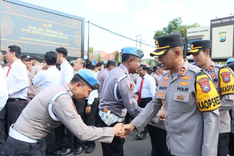 Kediri – Dalam suasana penuh kehangatan Idulfitri 1446 Hijriah, Kapolres Kediri Kota AKBP Bramastyo Priaji, S.H., S.I.K., M.Si., menggelar halalbihalal bersama pejabat utama (PJU), personel Polres Kediri Kota, serta jajaran Kapolsek, usai apel pagi di halaman Mapolres Kediri Kota, Selasa (8/4/2025).