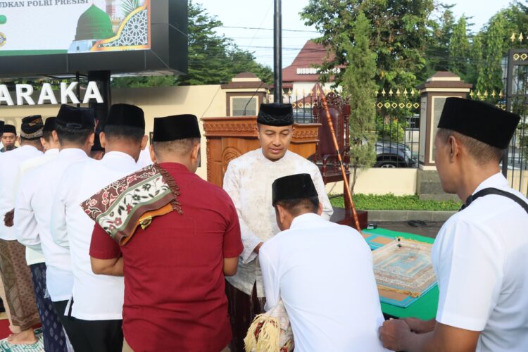 Kediri – Kapolres Kediri Kota, AKBP Bramastyo Priaji, S.H., S.I.K., M.Si, bersama jajaran Polres Kediri Kota serta Bhayangkari, melaksanakan Salat Idulfitri 1446 H di Lapangan Mapolres Kediri Kota, Senin (31/3/2025). Salat yang dipimpin oleh Ustad Idris, takmir Masjid Baiturahim Polres Kediri Kota, berlangsung khidmat dengan kehadiran para pejabat utama (PJU) dan anggota kepolisian.