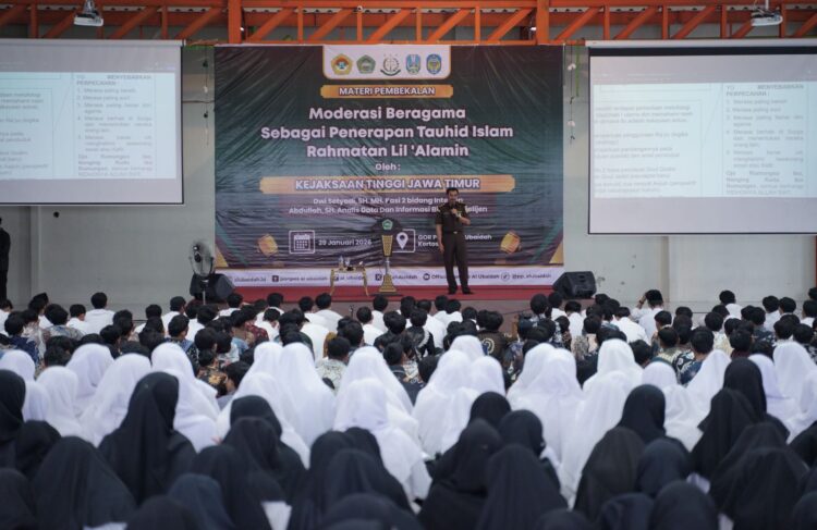 Nganjuk – Kejaksaan Tinggi (Kejati) Jawa Timur terus memperkuat perannya dalam menjaga keutuhan Negara Kesatuan Republik Indonesia (NKRI). Kali ini, Kejati Jatim membekali 1.066 santri Pondok Pesantren Al Ubaidah, Kertosono, Nganjuk, yang dipersiapkan menjadi juru dakwah Lembaga Dakwah Islam Indonesia (LDII), dengan wawasan kebangsaan dan penguatan moderasi beragama guna menangkal paham radikalisme dan intoleransi.