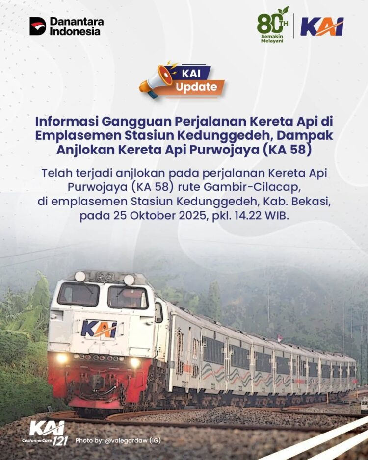 Madiun — Sejumlah perjalanan kereta api mengalami keterlambatan pada Sabtu (25/10) sore akibat gangguan operasional yang menimpa KA Purwojaya (KA 58F) relasi Gambir Cilacap di Stasiun Kedunggedeh, Kabupaten Bekasi.