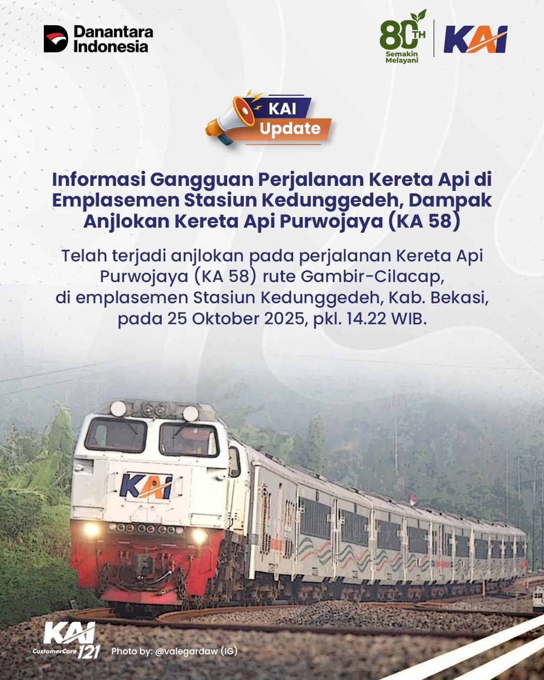 Madiun — Sejumlah perjalanan kereta api mengalami keterlambatan pada Sabtu (25/10) sore akibat gangguan operasional yang menimpa KA Purwojaya (KA 58F) relasi Gambir Cilacap di Stasiun Kedunggedeh, Kabupaten Bekasi.