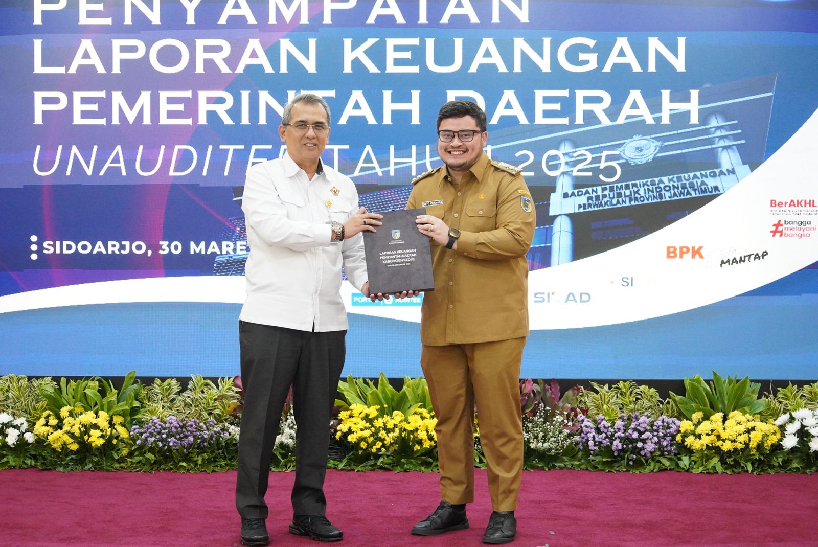 Kediri — Bupati Kediri, Hanindhito Himawan Pramana, menyerahkan Laporan Keuangan Pemerintah Daerah (LKPD) Kabupaten Kediri Unaudited Tahun Anggaran 2025 kepada Badan Pemeriksa Keuangan (BPK) Perwakilan Jawa Timur, Senin (30/3).
