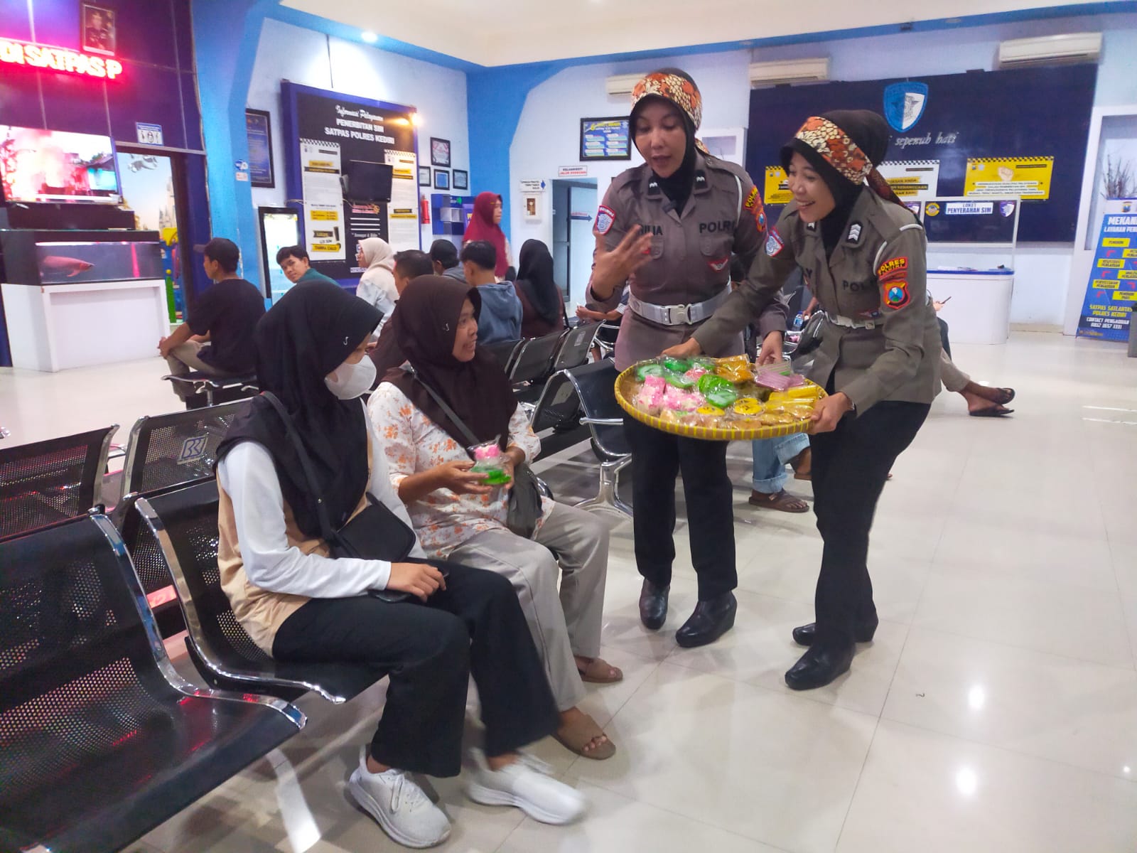 Tak hanya itu, petugas juga membagikan kue jajanan pasar serta brosur kepada para pemohon. Bahkan, masyarakat yang lulus ujian dan mendapatkan SIM turut menerima souvenir dari petugas.