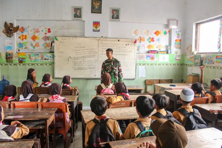 Kediri – Anggota Satuan Setingkat Kompi (SSK) Satgas TNI Manunggal Membangun Desa ke-127 Kodim 0809/Kediri dari Batalyon Infanteri 512/QY, Praka Dodik, memberikan materi wawasan kebangsaan kepada siswa Madrasah Ibtidaiyah (MI) Al-Munir, Desa Gadungan, Kecamatan Puncu, Kabupaten Kediri, Sabtu (28/2/2026).