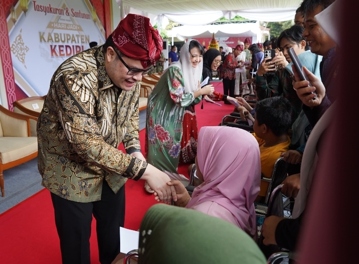 Rangkaian kegiatan diawali dengan penyerahan santunan kepada penyandang disabilitas dan anak yatim. Prosesi ini dipimpin langsung oleh Bupati Kediri bersama istri, Eriani Annisa, serta dihadiri Wakil Bupati Dewi Mariya Ulfa.